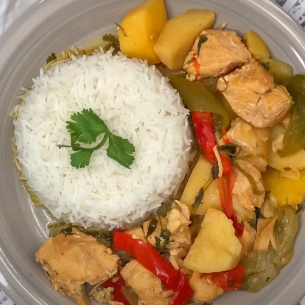 This hearty chicken stew is crafted using a pressure cooker, ensuring a quick and effortless preparation. The dish combines tender chunks of chicken with a variety of colorful vegetables, all simmering in a savory broth enriched with spices and herbs. The convenience of the pressure cooker means you can enjoy a nutritious and flavorful stew with minimal preparation time, perfect for a cozy family meal or a comforting dinner on a chilly evening. Garnished with fresh cilantro, this stew is as delicious as it is visually appealing.