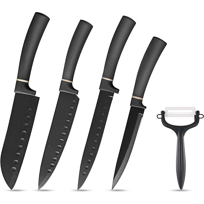Included in this set are a 6'' chef knife, 7'' santoku knife, 7'' slicer knife, 5'' utility knife, and a ceramics peeler, providing you with all the tools you need for prepping a wide variety of ingredients. From chopping and slicing to peeling and dicing, these knives are versatile and efficient. Whether you're a novice cook or a seasoned pro, the Elabo 5 Piece Black Kitchen Knife Set will elevate your culinary skills and bring a touch of style to your kitchen.