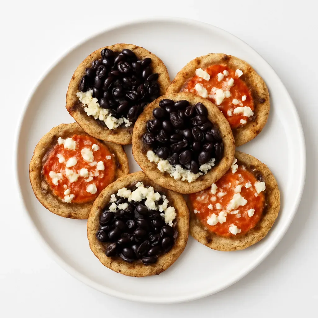 Experience the rich, traditional flavors of Oaxaca with these Memelitas Oaxaqueñas. Perfect as an appetizer or a delightful snack, these thick corn masa cakes are topped with a savory pork lard spread, crumbled cheese, a rustic roasted tomato and chili salsa, fresh diced onion, and optional whole cooked black beans. This Oaxacan classic pairs wonderfully with traditional Mexican beverages or a refreshing agua fresca.
