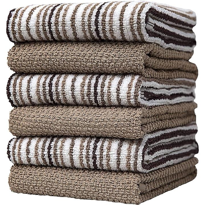 At a size of 16x26 inches, each towel is versatile for various kitchen tasks, while the tan color and popcorn stripe design add a stylish flair to your kitchen decor. This pack of 6 kitchen towels offers an ample supply for everyday use, and each towel features a convenient hanging loop for effortless storage and accessibility.