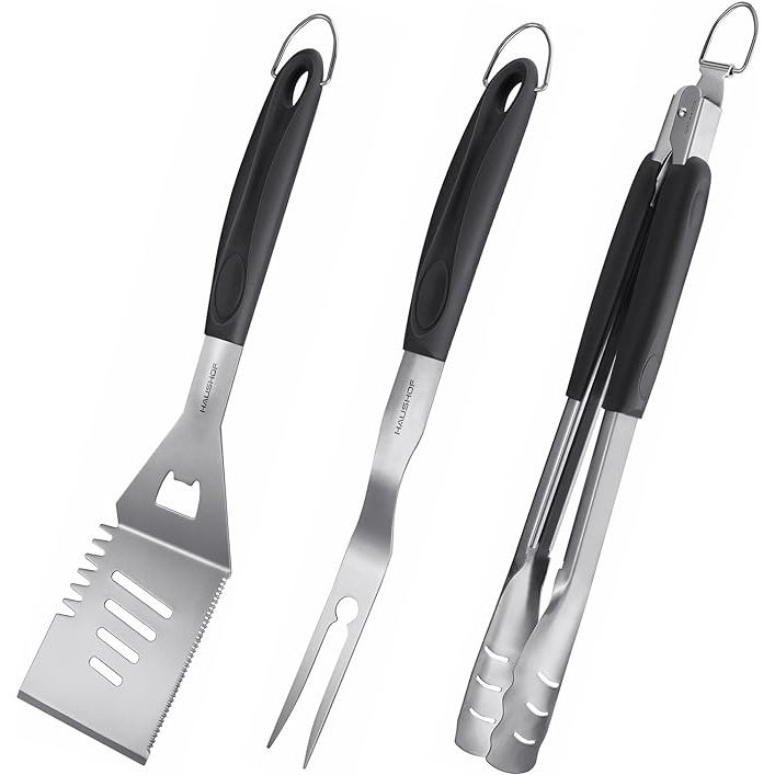 The HAUSHOF Large Grill Accessories Heavy Duty BBQ Set is the ultimate gift for outdoor cooking enthusiasts. Crafted from premium stainless steel, this set includes a spatula, fork, and tongs that are perfect for grilling. With a sturdy construction and measuring at 16.5 inches in length, these utensils are designed for durability and reliability during grilling sessions.