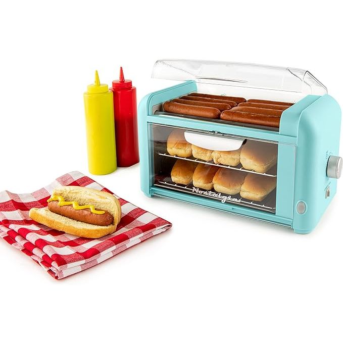XL 8-in-1 Hot Dog & Bun Warmer, stainless steel rollers, non-stick racks, timer.
