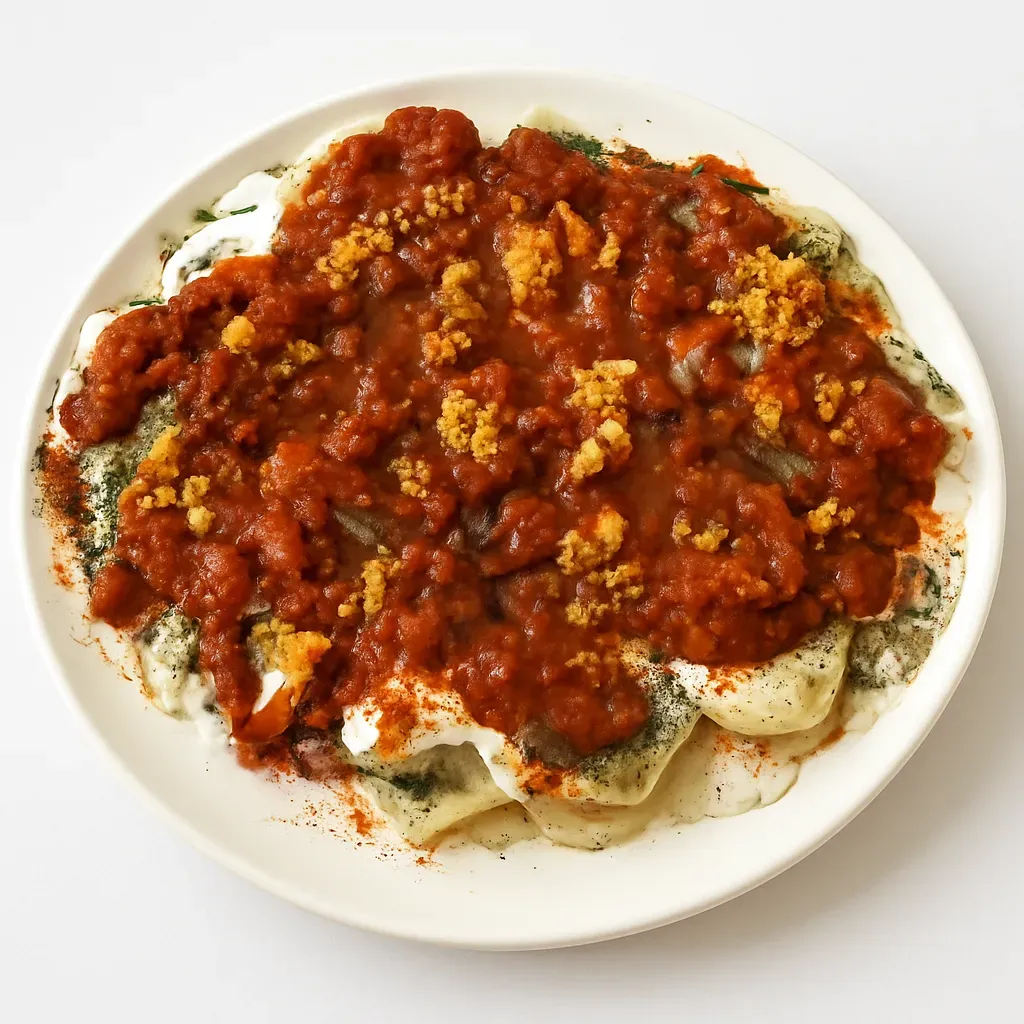 - Layer a serving dish with creamy yogurt sauce, followed by a layer of dumplings.
