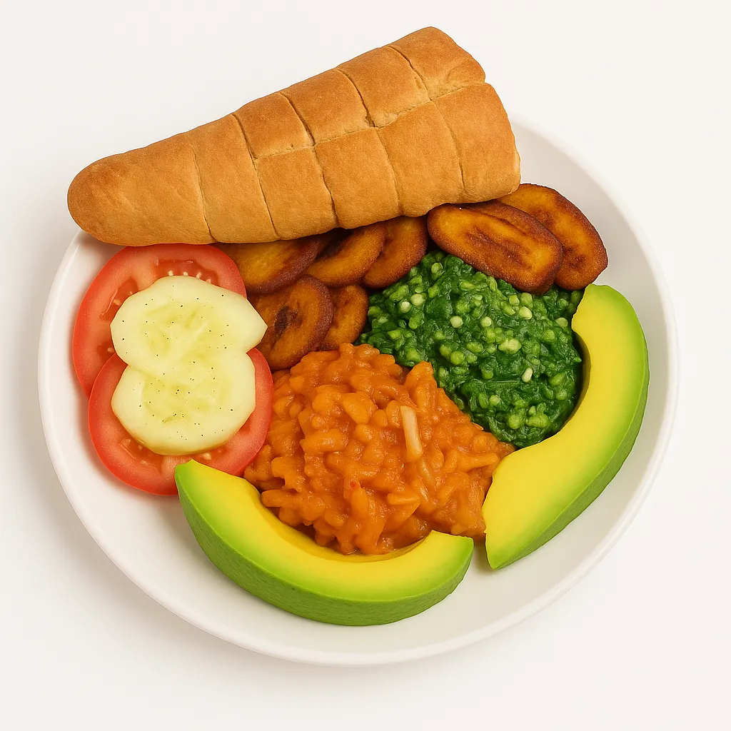 - Add the "chop up," fried plantains, sliced avocado, and fresh salad.