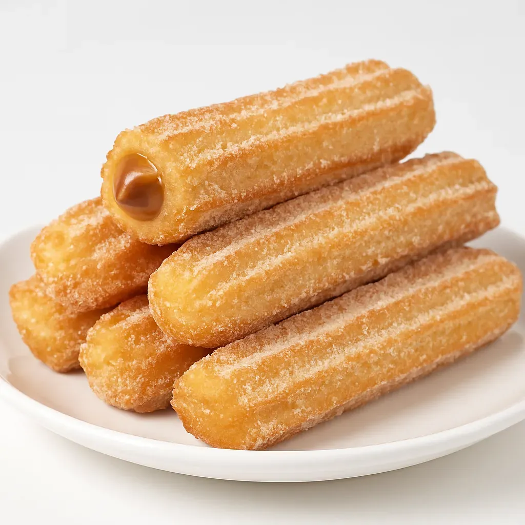 - Using a narrow-tipped squeeze bottle, carefully inject each churro with dulce de leche, filling the center.
