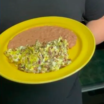 Machaca con Huevo is a traditional Mexican dish originating from the northern regions of Mexico. It's made using machaca, which is dried and crushed beef, combined with scrambled eggs for a savory and protein-rich breakfast. Served with beans and salsa, this dish is a favorite for its rich flavors and heartiness.