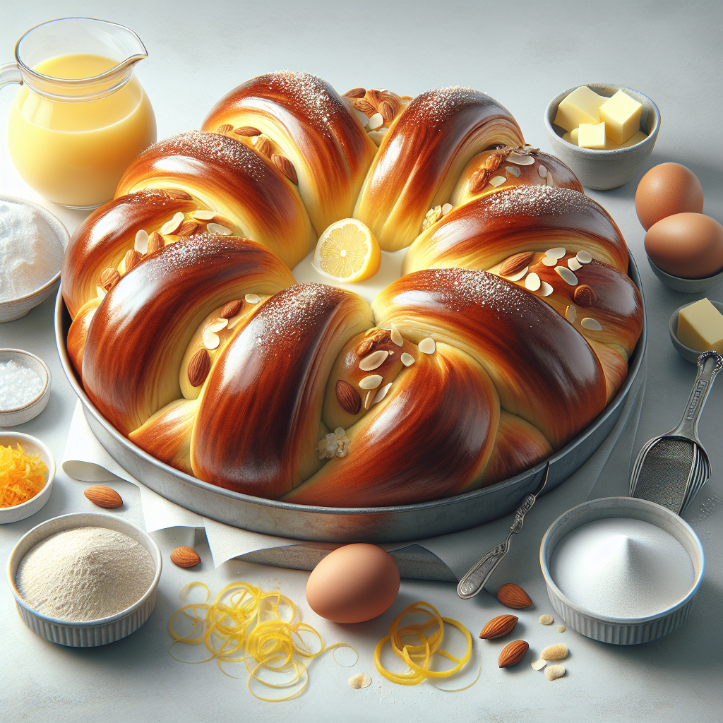 11. Brush the braid with a mixture of egg yolk and a splash of milk, then sprinkle with pearl sugar and almond flakes, if desired.
