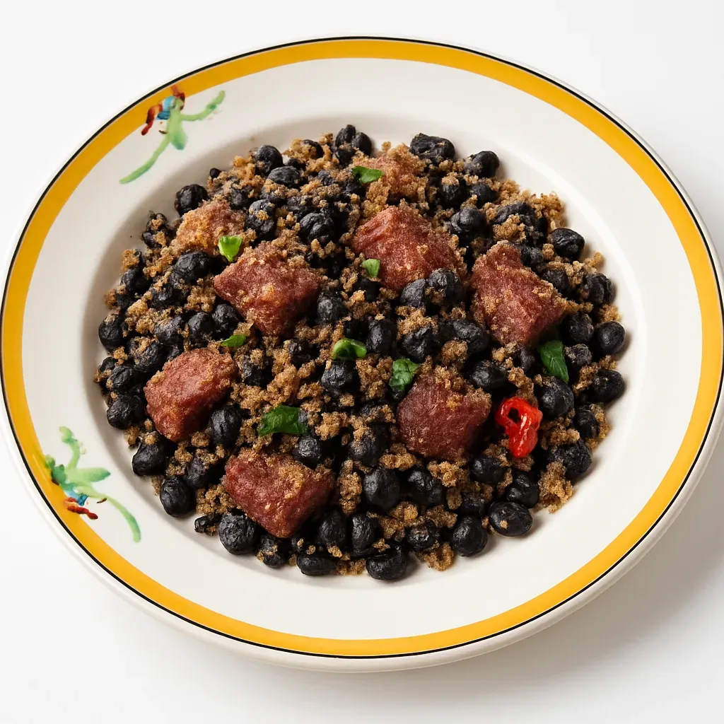 Feijão Tropeiro Gaúcho is a celebrated dish hailing from the Brazilian state of Rio Grande do Sul. Traditionally enjoyed by cowboys (or "tropeiros"), this savory meal combines the rich flavors of mixed meats, garlic, and onions with the earthy texture of black beans and manioc flour. Garnished with fresh herbs and a hint of chili, it reflects the robust culinary heritage of southern Brazil.