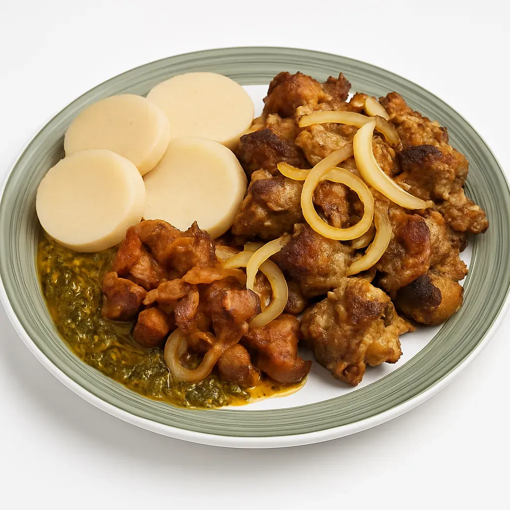 - Serve the grilled goat meat and caramelized onions on a plate with sliced Kikuanga. Accompany with a serving of Fúmbua sauce.