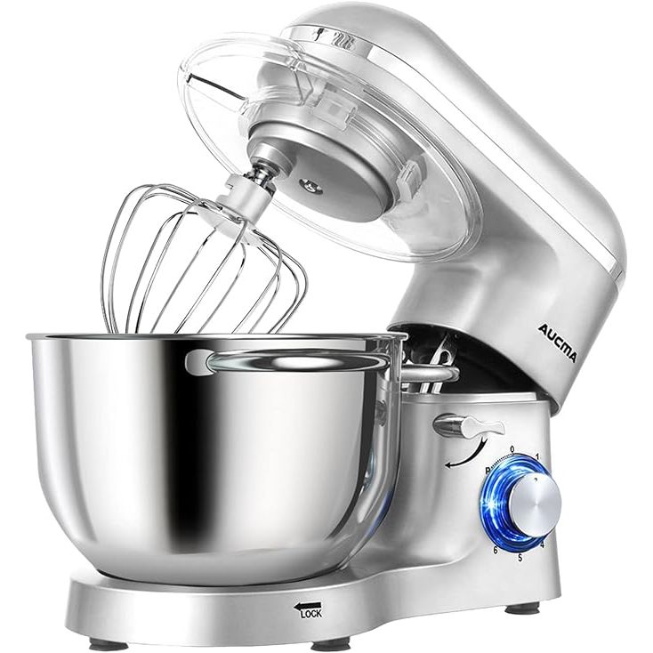 Equipped with versatile attachments including a dough hook, wire whip, and beater, this mixer is a versatile companion for all your mixing needs. Its sleek silver finish not only adds a touch of sophistication to your kitchen but its functionality caters to both amateur bakers and seasoned chefs alike. Whether you're whipping up a batch of cookies or mixing a bread dough, the Aucma Stand Mixer is sure to become a trusted tool in your culinary arsenal. Description by ChatGPT.