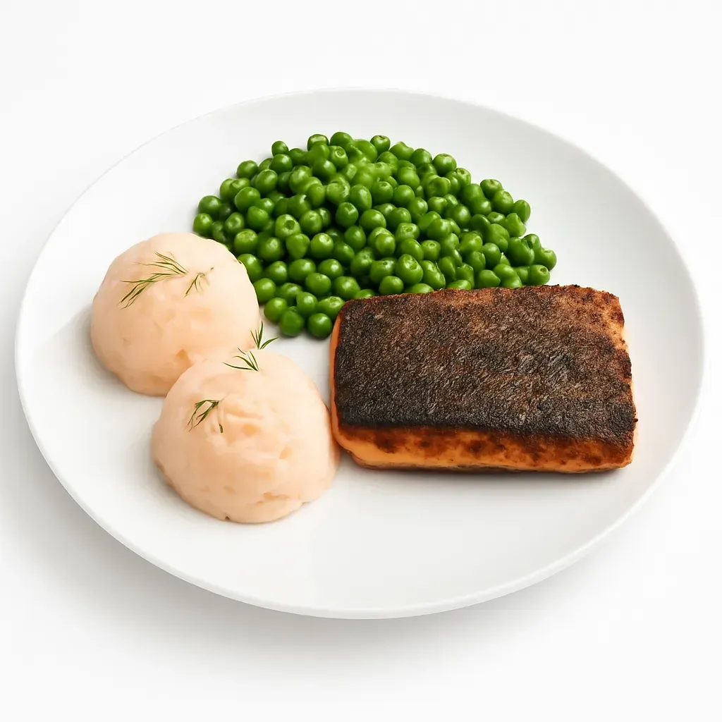 Blackened Arctic Char with Mashed Potatoes and Dilled Butter Peas