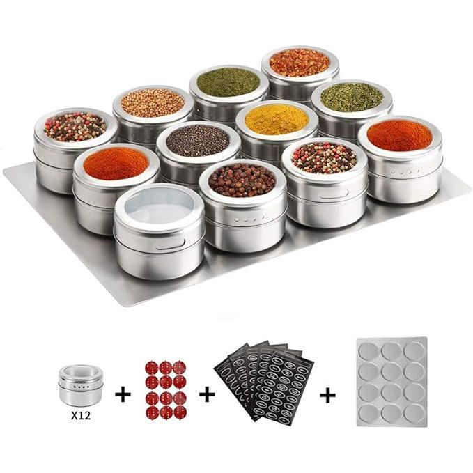 12 Magnetic Spice Tins,Stainless Steel Spice Jar Containers ,With Wall Mounted Spice Jars Organizer,New Magnetic Spice Jar,Includes 120 Labelling Stickers.