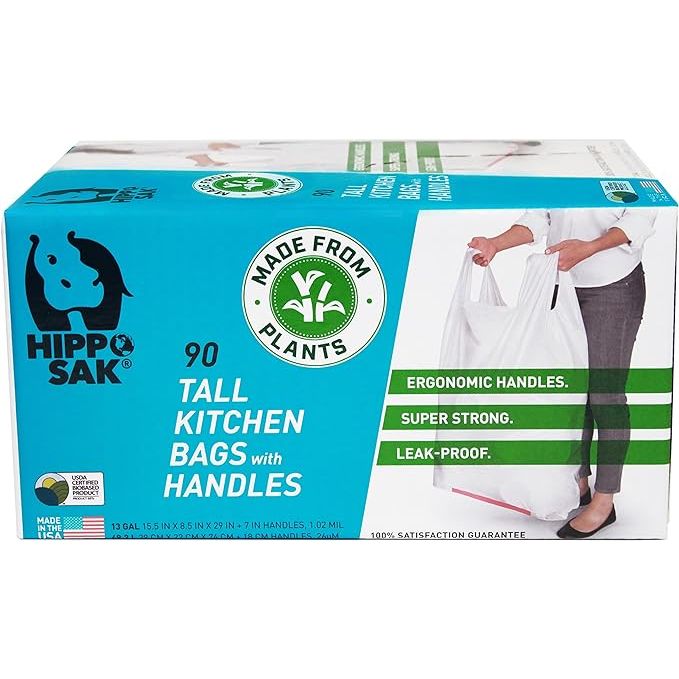 Hippo Sak Plant-Based 13 Gallon Kitchen Trash Bags with Handles - Strong, Leak-Proof & Eco-Friendly (90 Count)