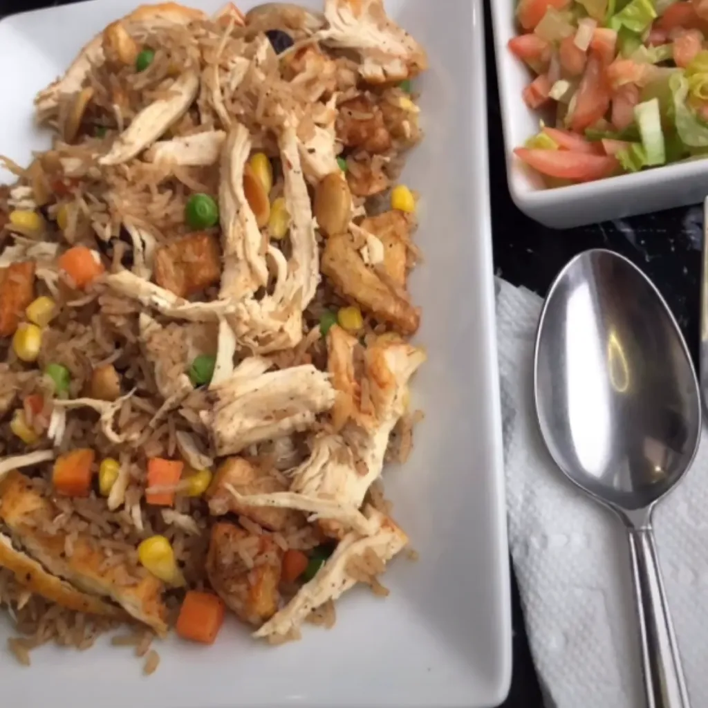 - Mix the shredded chicken, fried vegetables, almonds, and raisins with the cooked rice.