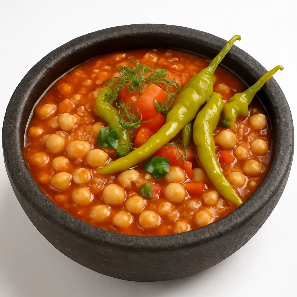Spicy Algerian Doubara Homs is a beloved dish from the Biskra region, famed for its rich, spicy flavors and comforting textures. This robust chickpea stew is cooked in a spicy tomato-based sauce and finished with fresh garnishes. Packed with aromatic spices, the dish embodies the heart of Algerian cuisine, perfect for a warming and satisfying meal.