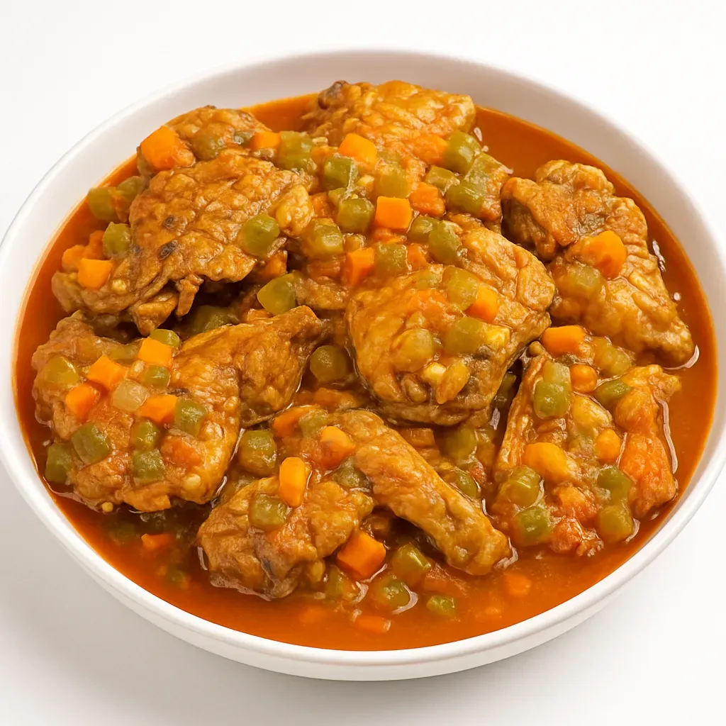Experience the rich culinary traditions of Angola with this Hard Chicken Angolan-Style Stew, locally known as "Galinha Rija Moda Angolana." This comforting dish is a treasured staple of Angolan cuisine, celebrated for its dynamic flavors derived from a medley of peppers, tomatoes, and a secret homemade seasoning. Perfectly seasoned chicken is fried to a golden brown before simmering into tender perfection in a savory sauce that pairs beautifully with rice.