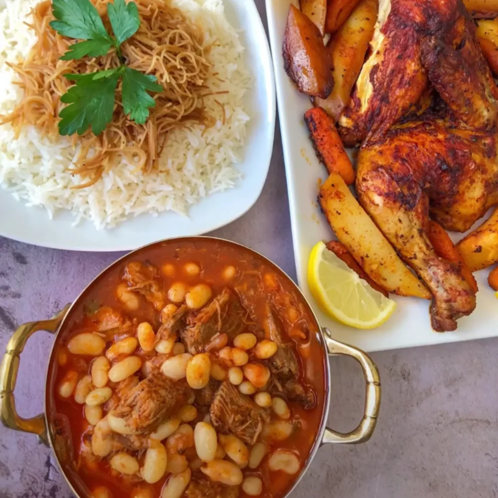 Fasoli Soup with fluffy white rice and succulent oven-roasted chicken is a comforting Kurdish meal perfect for family gatherings. The dish offers a blend of flavors and satisfying textures with hearty kidney beans and tender beef in a tomato-base soup, paired with fluffy basmati rice. The oven-roasted chicken, seasoned with a mix of spices and vinegar, adds a savory element to the meal. The option to include vermicelli with the rice adds a delightful variety to the spread. This comforting meal is sure to bring everyone together around the table, making it ideal for sharing a taste of culture and warmth.