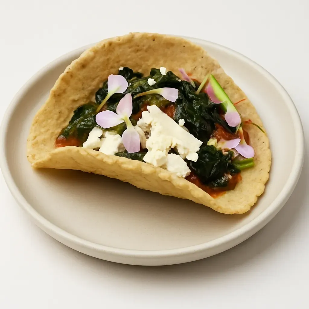 - Place the cooked greens onto warm corn tortillas, drizzle with the mojo and arbol salsa, and garnish with crumbled queso fresco and daikon blossoms. Serve immediately.
