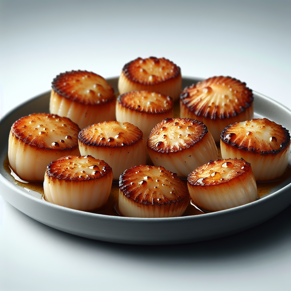 3. Sear the scallops for about 1 to 2 minutes on one side until they develop a golden crust, then flip them. Cook for an additional 1 to 2 minutes. Remove the scallops from the pan and set them aside on a warm plate.