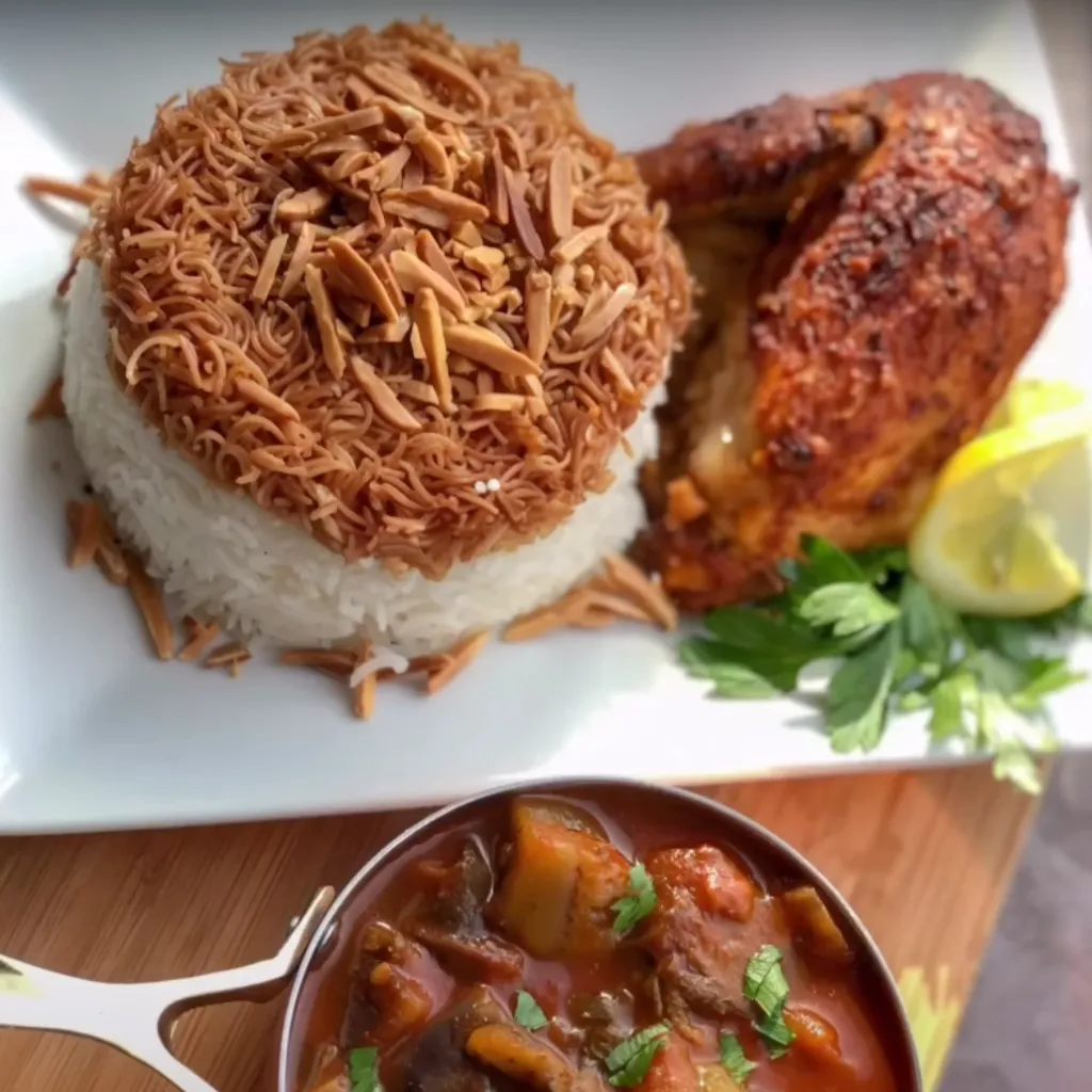 Kurdish Style Roasted Chicken with Eggplant Stew and Basmati Rice