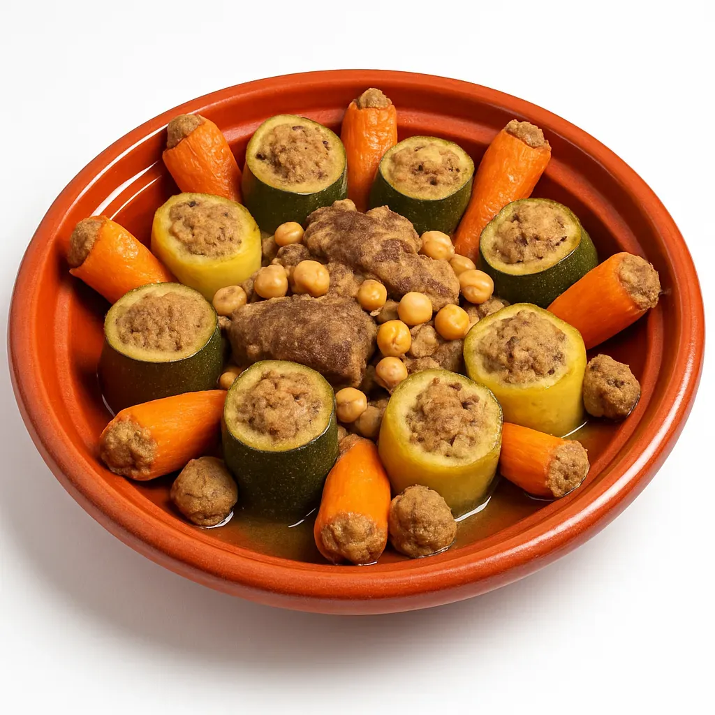 Embark on a culinary journey with this Moroccan Dolma, featuring a medley of zucchini, potatoes, and carrots, all tenderly stuffed with a softly spiced minced meat and rice mixture. Slow-cooked in a fragrant, turmeric-ginger sauce alongside hearty veal chunks and chickpeas, this traditional dish offers deep, rich flavors with a modern twist, perfect for a savory main course.