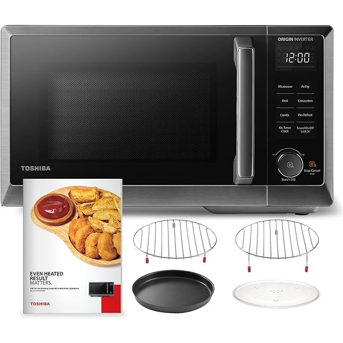 Cut calories and enjoy crispy, fried foods without the added oil with the 360° heat circulation air fry feature of the TOSHIBA convection microwave. Equipped with 11 Auto Menus, 10 Air Fry Menus, and 6 Defrost Presets, this microwave is perfect for beginners and seasoned chefs alike. The included bake tray, wire racks, and original cookbook with 27 recipes make it easy to explore new culinary creations and elevate your cooking skills.