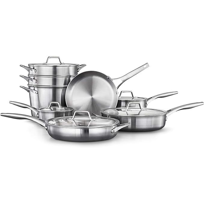 Upgrade your kitchen with the Calphalon 13-Piece Pots and Pans Set, a premium stainless steel cookware collection designed for everyday use. Crafted with durable stainless steel, these pots and pans provide even heating and are resistant to rust and corrosion. The ergonomic stay-cool handles ensure safe and comfortable handling during cooking.