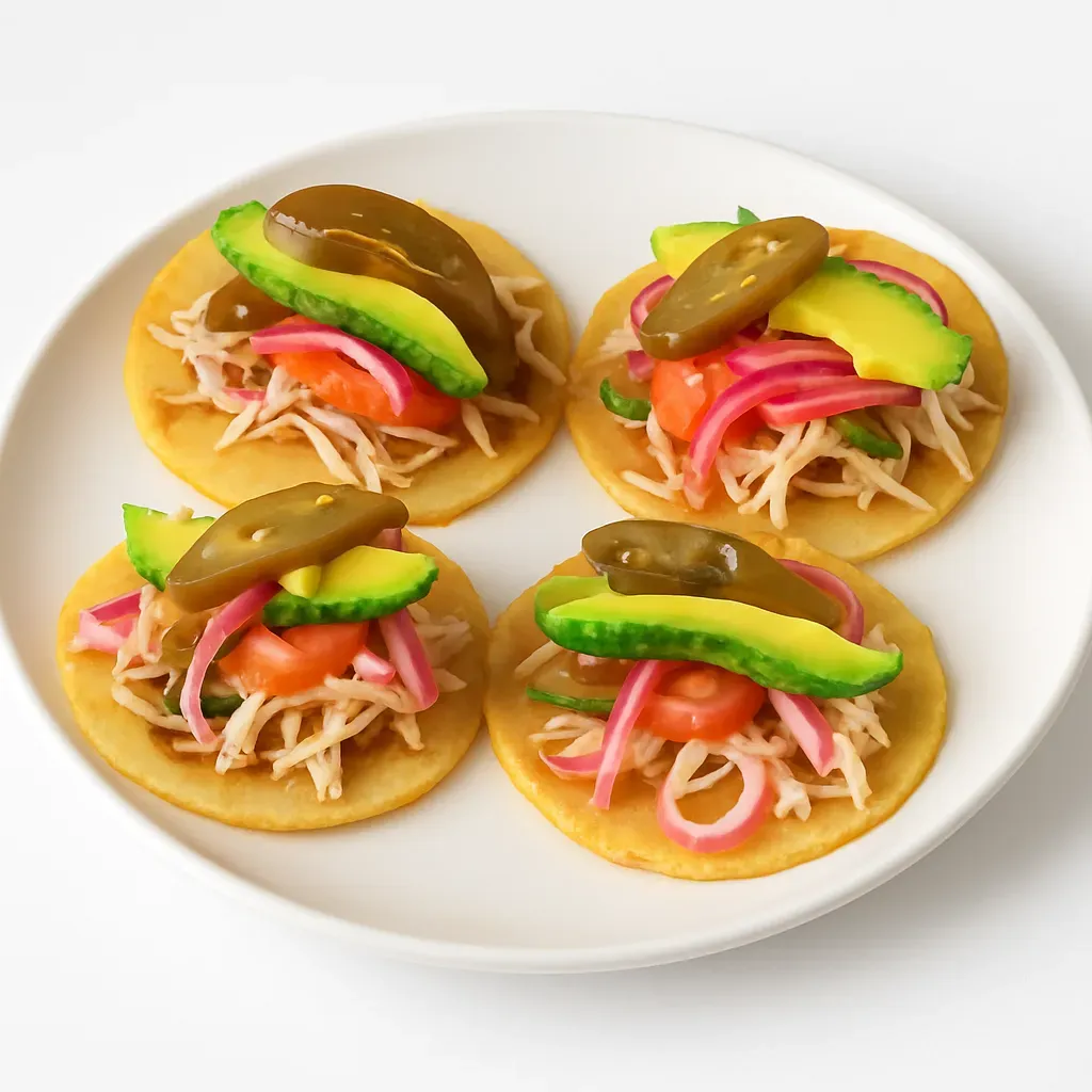 - On serving plates, top each panucho with shredded chicken, lettuce, pickled red onion, avocado, and jalapeño.
