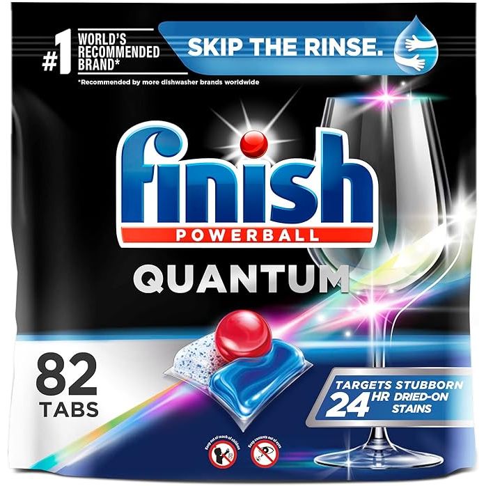 Experience the revolutionary power of Finish Quantum dishwashing tablets, your ultimate ally for effortlessly pristine dishware. This bulk package includes an impressive array of 82 tablets, each infused with the dynamic Powerball technology to ensure a gleaming finish and unyielding stain removal—sidestepping the cumbersome pre-wash rituals.