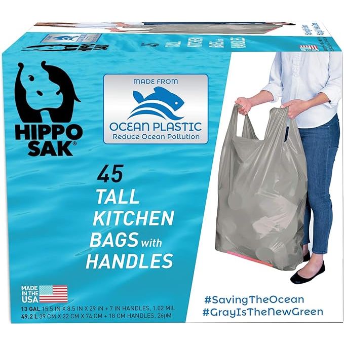 Hippo Sak 13 Gallon Eco-Friendly Tall Kitchen Bags with Handles, Made of Recycled Ocean Plastic - Leak-Proof & Strong (45 Count)
