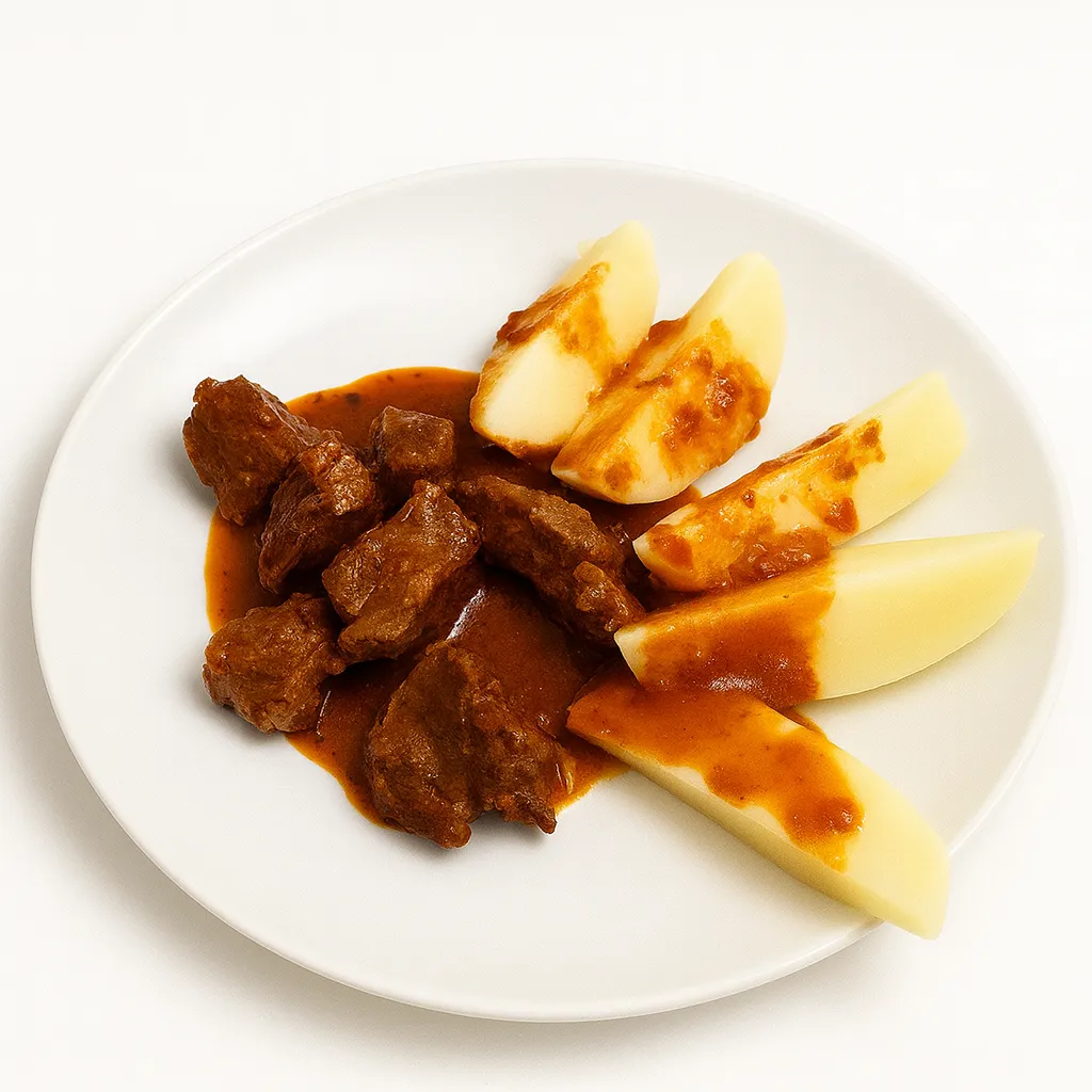 12. Once ready, serve the goulash hot, accompanied by boiled potatoes, a shot of Hungarian 'pálinka', and a fresh cucumber salad.