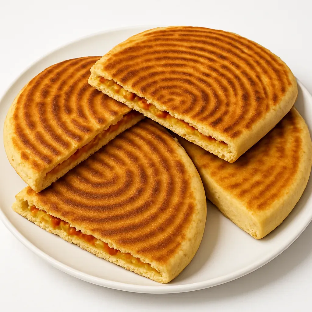 - Preheat a cast iron griddle and place the stuffed bread on it.