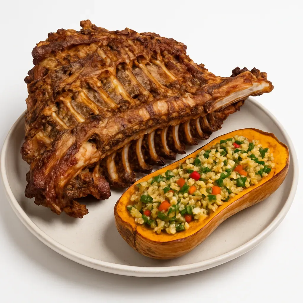 - Presentation: Serve lamb on a wooden board, accompanied by stuffed squash.