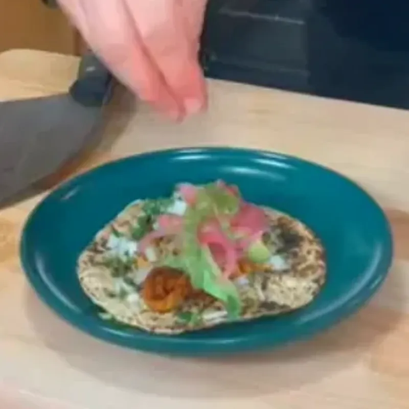 - Add diced onion, chopped cilantro, sliced avocado, and a generous helping of pickled red onions.