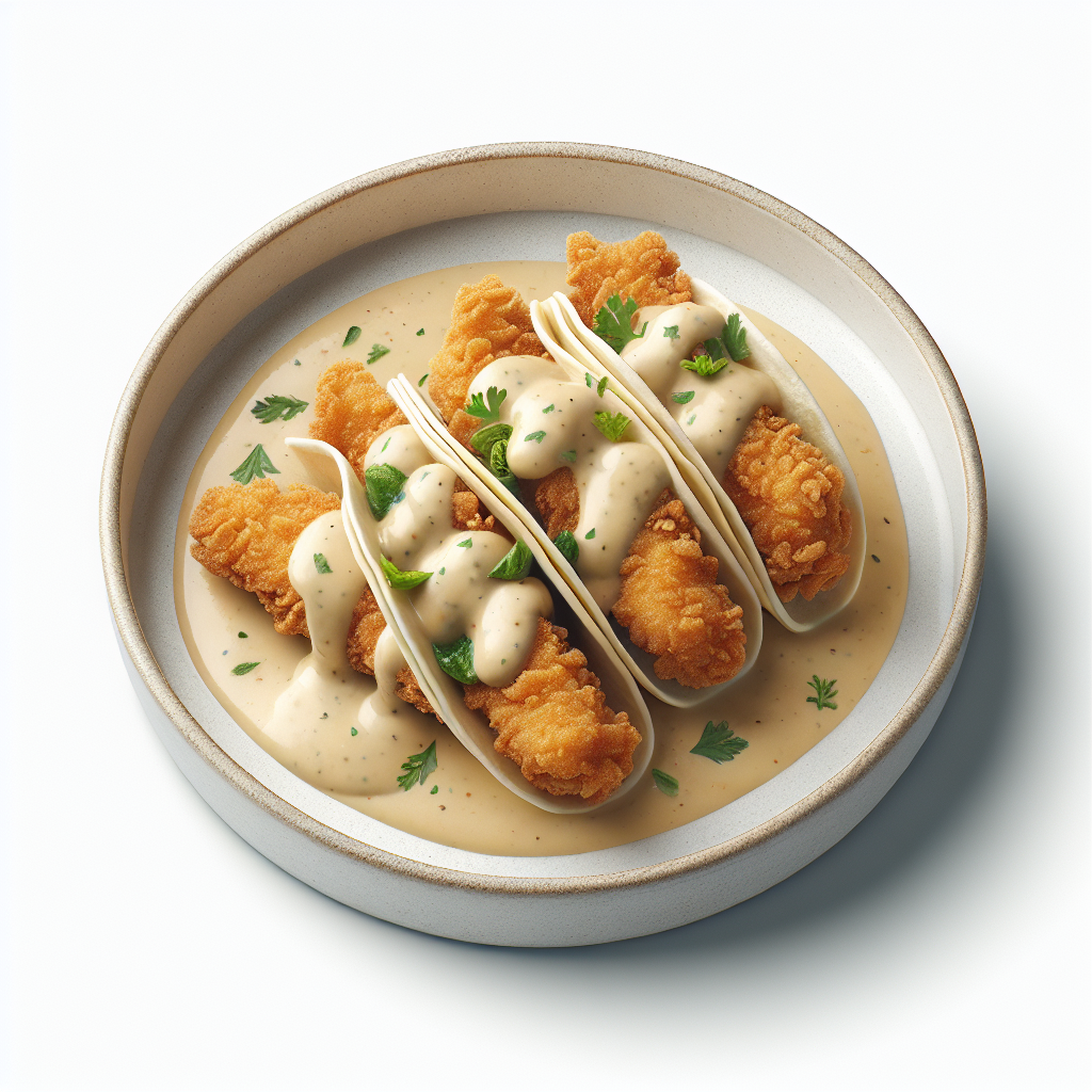Chicken-Fried Steak Tacos is a robust fusion dish combining the crispy, Southern comfort of chicken-fried steak with the convenience and zest of traditional Mexican tacos. Strips of tenderized beef are seasoned, coated in a seasoned flour mixture, and then fried until golden brown for that classic crunchy exterior. These crispy beef strips are nestled into warm tortillas and drizzled with a creamy and peppery gravy that adds richness to the dish. The tacos are often topped with shredded lettuce, diced tomatoes, and a sprinkle of cheddar cheese, offering a satisfying crunch and burst of flavor with every bite. A versatile meal, these tacos are perfect for a casual dinner, a game day feast, or any occasion where bold flavors and textures are celebrated. Description by ChatGPT.