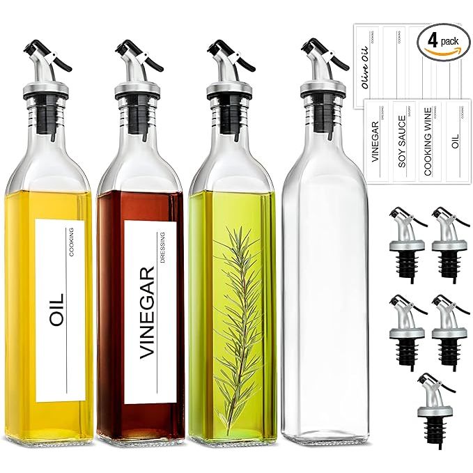 Revamp your kitchen with the GMISUN Oil Dispenser Bottle Set, which features an upgraded flip-top spout for easy, controlled oil dispensing. When not in use, the spout can be closed tightly to keep oils fresh and clean. This set includes 4 bottles, 5 flip spouts, preprinted and blank labels, and a wide-open funnel, making it a versatile kitchen addition.