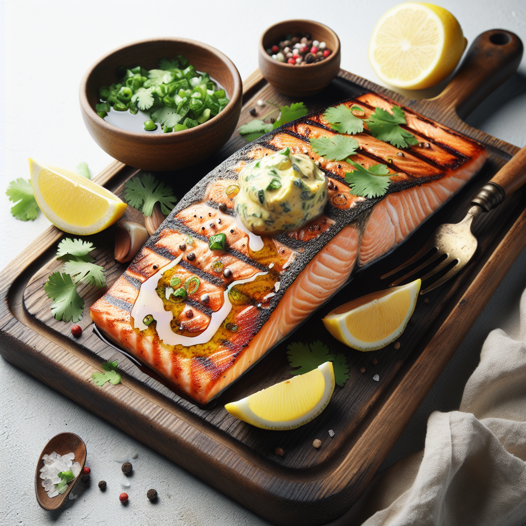 This gourmet Grilled Cedar Plank Salmon recipe combines the smoky essence of grilling with a rich cilantro garlic butter and zesty lemon. The salmon is cooked on a cedar plank, resulting in tender, flavorful bites. Ideal for barbecues or an elegant dinner, this dish promises a sensory delight with its aromatic and succulent quality. The dish is completed with a garnish of lemon wedges and is perfect when served with sides like grilled asparagus and creamy mashed potatoes.