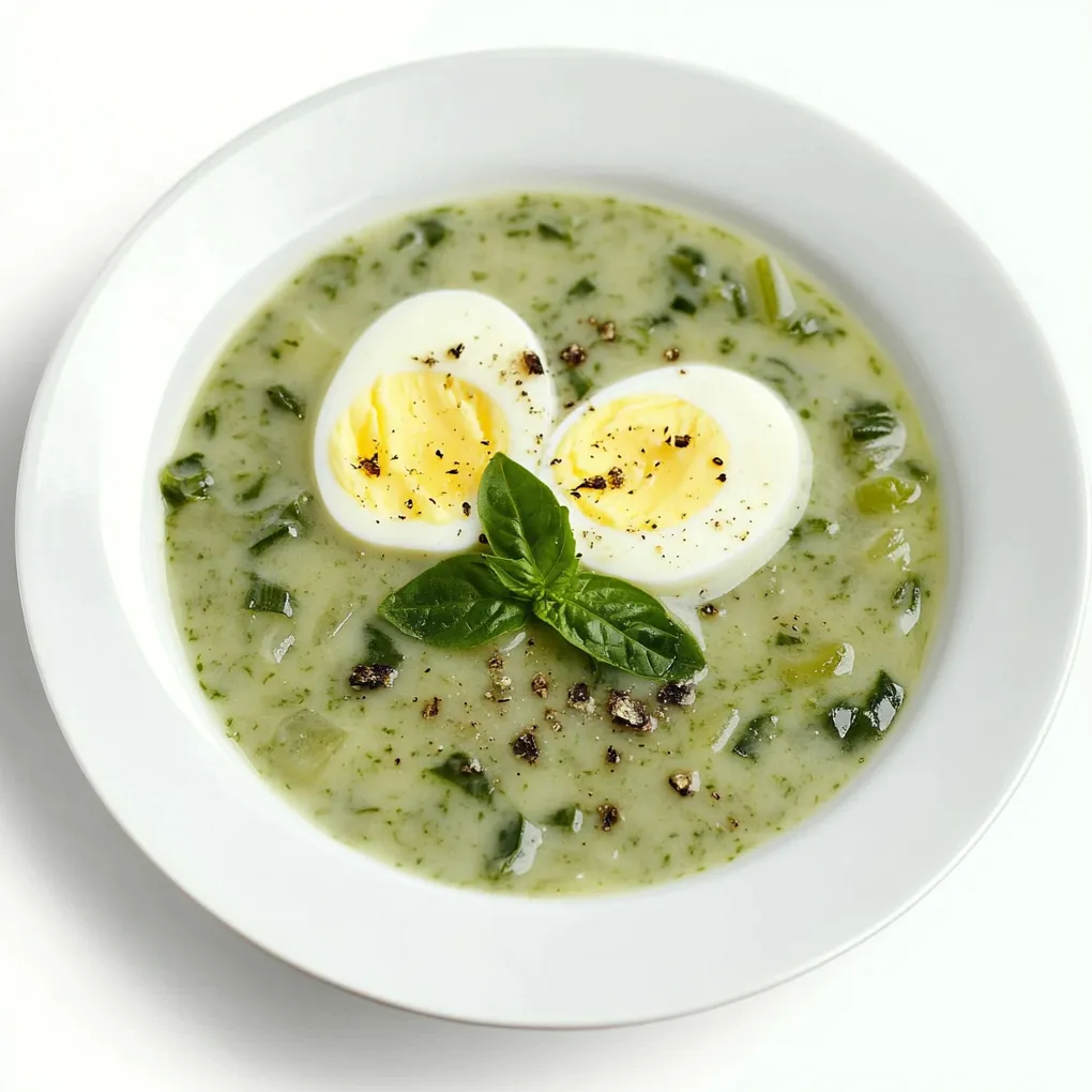 Sauerampfer Suppe: Sorrel soup with potatoes, eggs, cream.