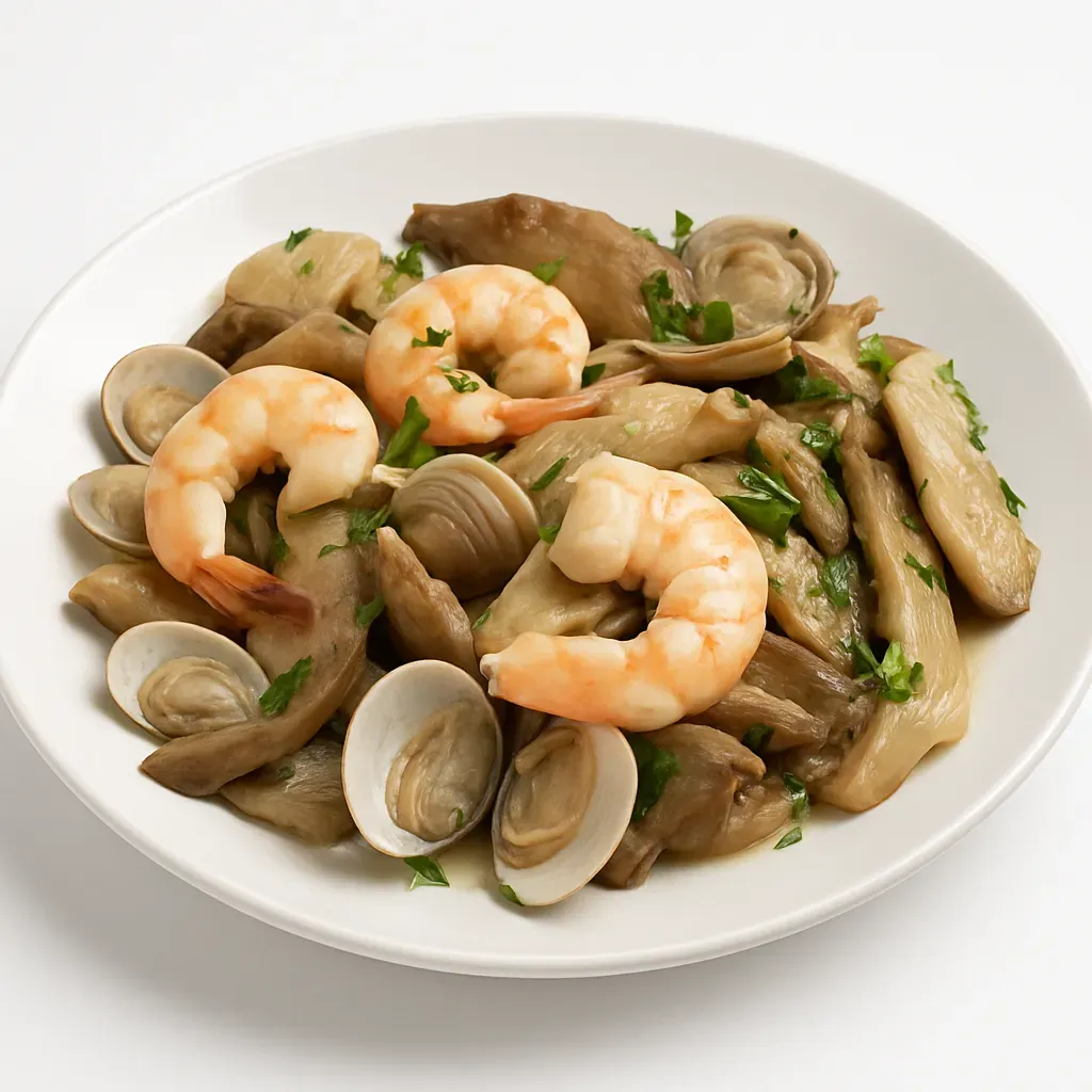 Spanish Sauté with Oyster Mushrooms, Clams, and Prawns