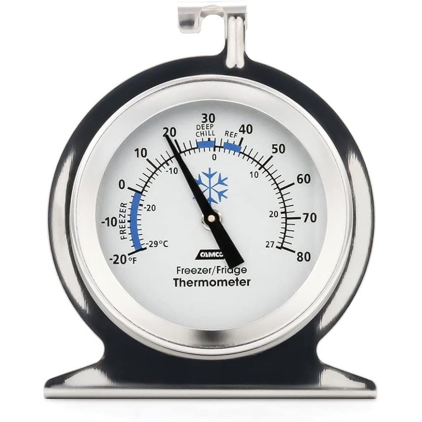 Ensure your food storage areas are at safe temperatures with the versatile Camco 42114 Thermometer. This compact tool is perfect for monitoring temperature in refrigerators, freezers, and dry storage spaces, with a range of -20°F to 80°F (-30°C to 30°C) for accurate readings. Equipped with a sturdy hook for hanging or a stand for placement on a shelf, this thermometer offers flexibility in display options while ensuring long-lasting durability.