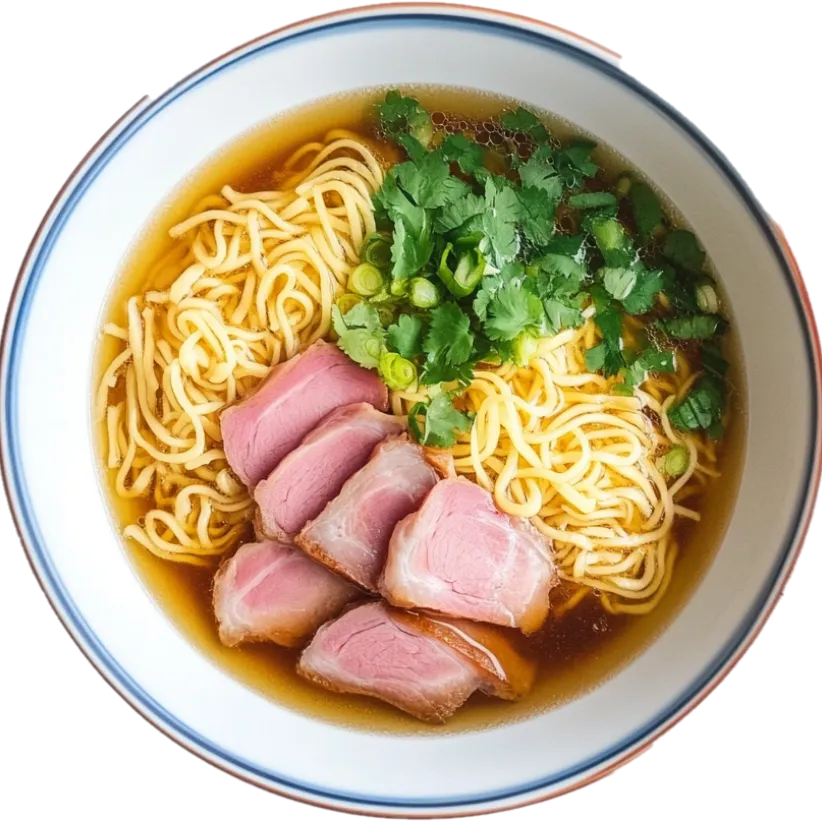 10. Prepare your bowl by placing a portion of noodles in the bottom. Ladle the hot dashi broth over the noodles. Top with slices of char siu, kamaboko fish cake, a boiled egg, and optional Spam slices. Garnish with thinly sliced scallions.