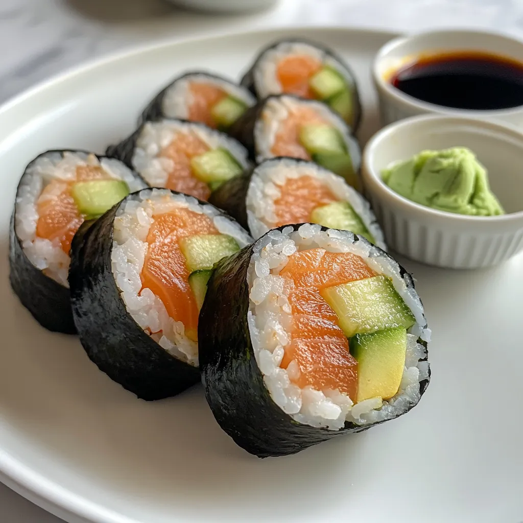 Salmon, Avocado, and Cucumber Sushi Rolls are a classic and popular variety of sushi, known for their smooth, creamy texture and fresh flavors. These rolls feature a combination of velvety avocado and crisp cucumber with rich, buttery slices of fresh salmon, all wrapped up in sushi rice and nori seaweed. The rolls are typically cut into bite-sized pieces, making them perfect for sharing and dipping into soy sauce, wasabi, or pickled ginger. They're a favorite for sushi lovers and are both nourishing and satisfying, delivering a burst of Omega-3s from the salmon. Their visual appeal and balance of flavors make them ideal for any sushi night or as part of a larger Japanese-inspired feast. Description by ChatGPT.