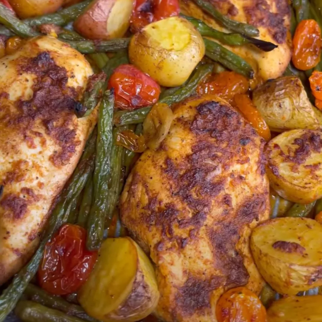 This effortless and delightful sheet pan chicken with roasted veggies combines succulent chicken breasts with tender green beans, creamy baby potatoes, and juicy cherry tomatoes. A tangy, spicy marinade elevates the dish, making it a crowd-pleaser that's both wholesome and flavorful. Perfect for busy weeknights, this all-in-one meal requires minimal preparation and promises to satisfy everyone at the table.