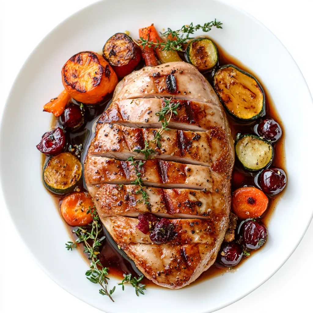 11. Slice the rested duck breast and plate it up. Drizzle generously with the warm Madeira and cherry sauce. Garnish with fresh herbs if desired.